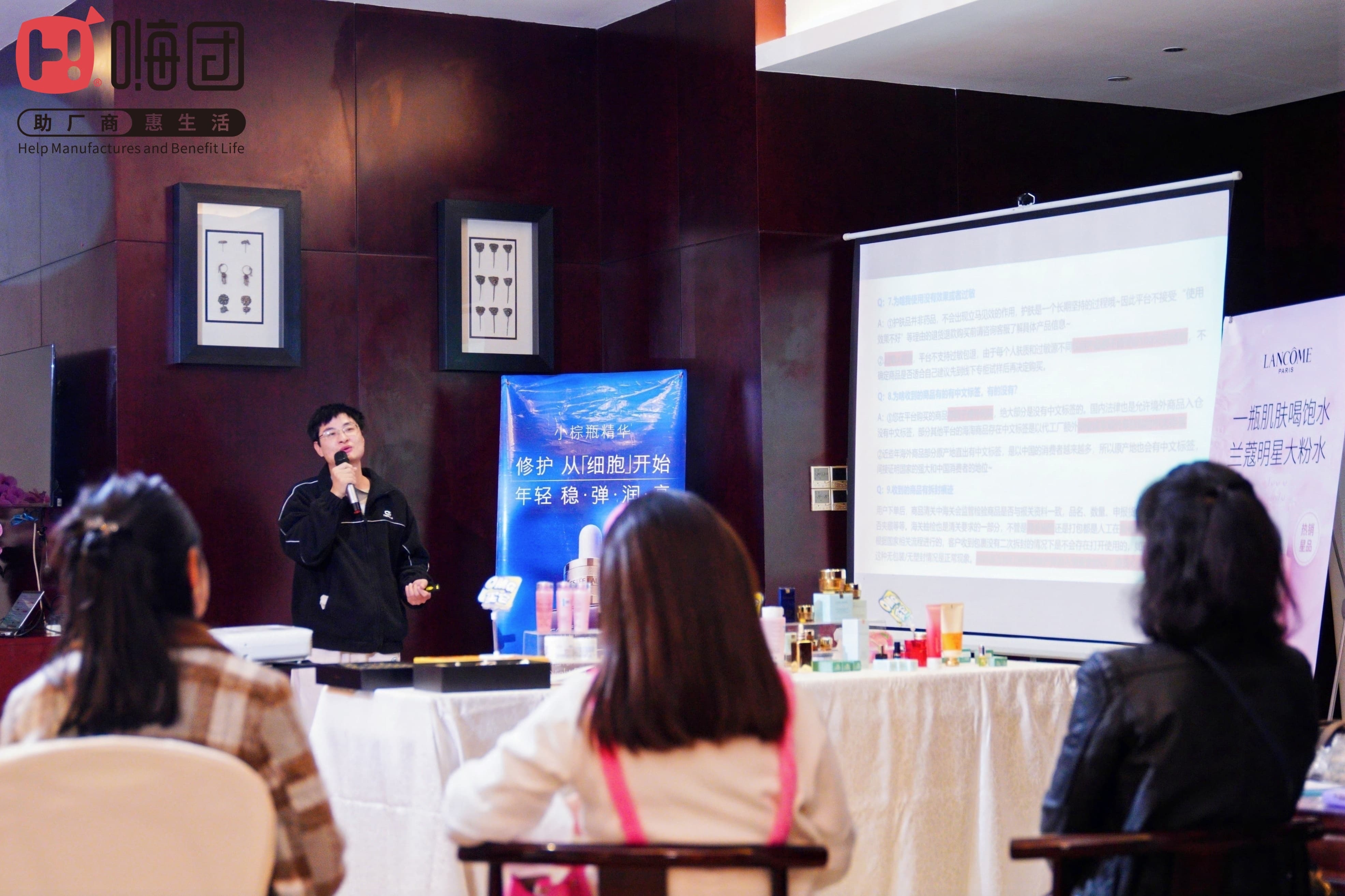 活动伊始,一场别开生面的“美妆品鉴与保税仓知识小课堂”在会议室内率先开启。现场陈列了海蓝之谜、兰蔻、雅诗兰黛等多款热门单品,工作人员带领大家从外包装、瓶身工艺、膏体质地到独特香气,进行了一场细致的“沉浸式品鉴”。嗨团伙伴们通过亲身体验与细致比对,深刻感知到其与专柜品质的完全一致,信任感油然而生。